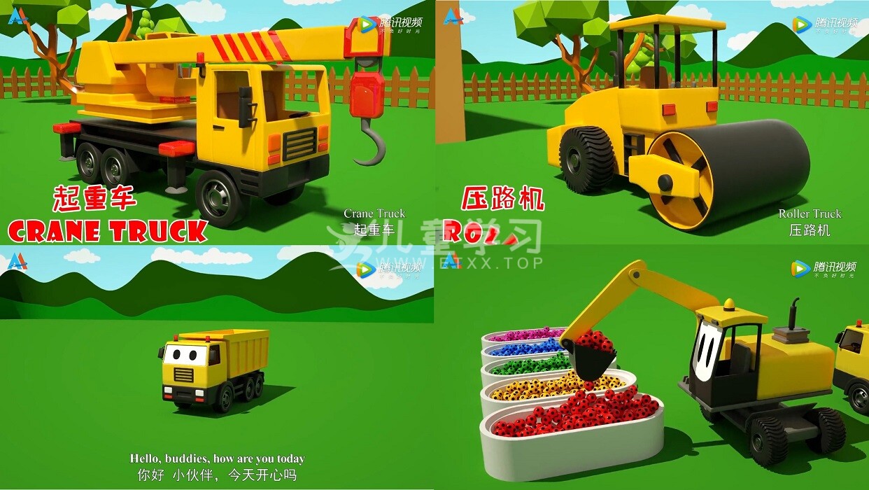 宝宝们最喜欢的工程车好伙伴们来了:挖掘机、压路机、翻斗车、搅拌机、起重车、推土机、拖拉机、水罐车、割草机、铺路机、装载车、多功能工程车、垃圾车、消防车、半挂车、运输车等等。 看看他们是怎么组装起来的,并且他们会带你学会各种颜色的英文和中文发音,他们还会展现自己的独特本领:建桥、修路、种草、喂牛等等,来跟工程车好伙伴一起度过快乐的时光吧。